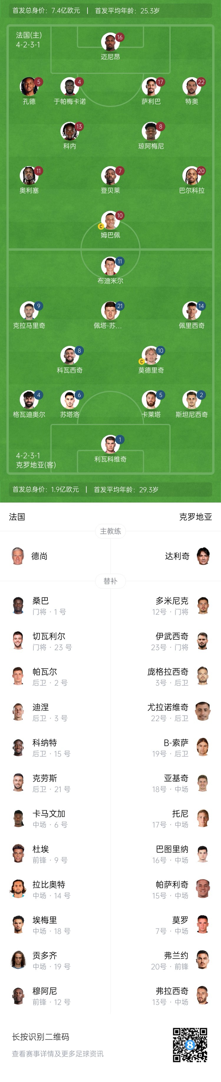 2025-03-24 06:15:21法國vs克羅地亞首發:姆巴佩、登貝萊、巴爾科拉先發,魔笛出戰