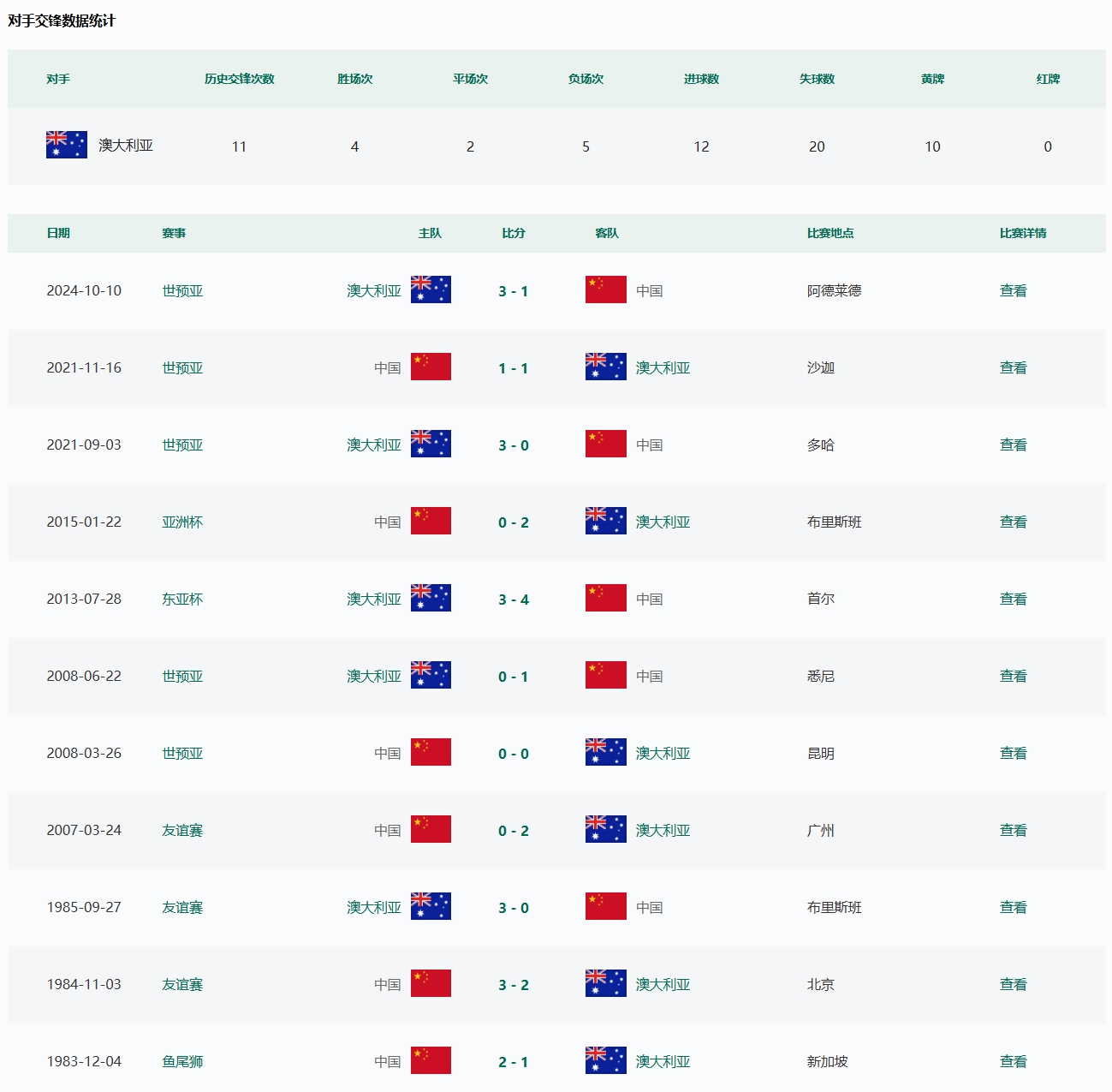 根據(jù)中國足協(xié)官網數(shù)據(jù)顯示,國足此前共11次交手澳大利亞,取得4勝2平5負的戰(zhàn)績。