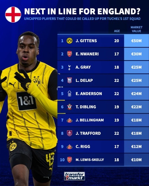 2月25日訊 英格蘭將在下月的世預賽中對陣阿爾巴尼亞以及拉脫維亞,圖赫爾也將公布執教英格蘭的首期名單,德轉列出了10名未代表英格蘭成年隊出戰過,但本次可能入選圖赫爾首期名單的球員,吉滕斯、恩瓦內里、斯凱利、喬布-貝林厄姆等人在列。