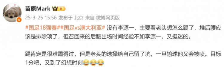 3月25日訊 國足今晚將在世預賽杭州主場對陣澳大利亞,媒體人苗原發文談到對國足陣容的看法。