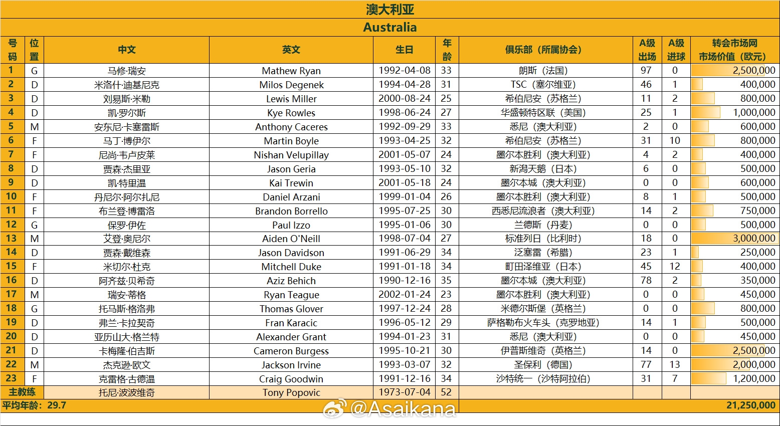 2025-03-25 18:26:07國足vs澳大利亞名單對比:平均年齡28.1-29.7,身價1145萬-2125萬