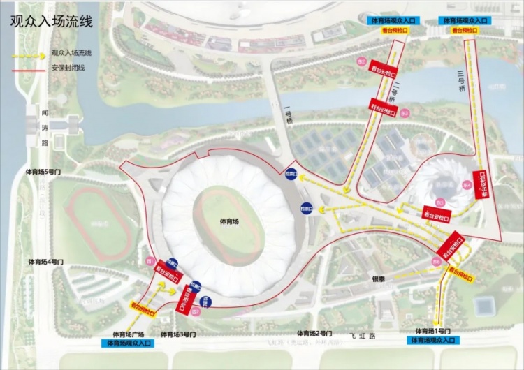 抵達現場的觀眾,可經由 1 號門、西廣場、2 號橋以及 3 號橋前往體育場入口,有序入場。建議龍之隊、長城、中國制躁等有組織的球迷通過3號橋專用通道到達安檢口。