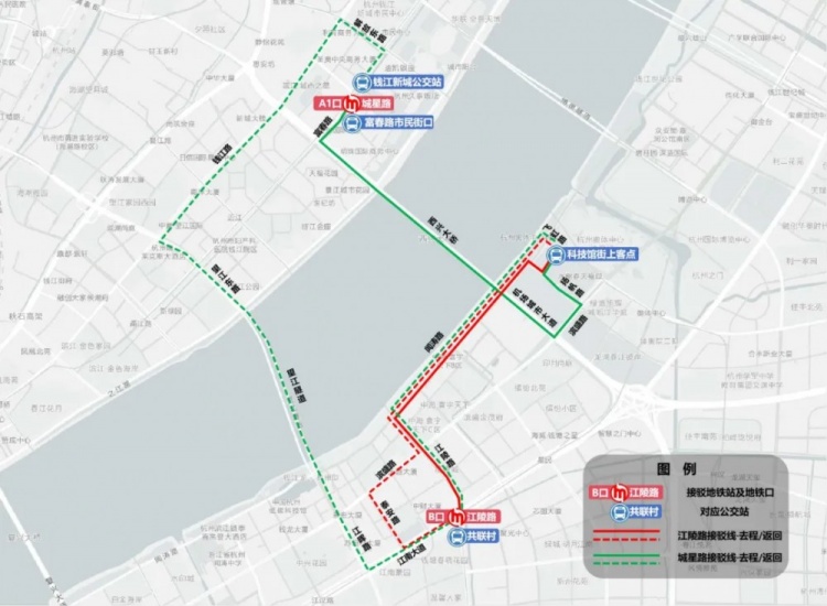 2.公交接駁:在飛虹路科技館街交叉口設置2條公交接駁專線將觀眾分別送至地鐵1號線江陵路站、地鐵4號線城星路站。