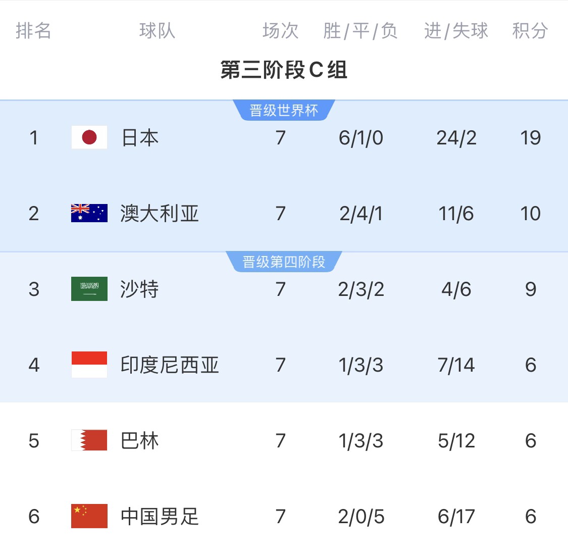 (注:澳大利亞如果戰勝中國,積分13,沙特輸給日本積分9;接下來的兩場哪怕澳洲也輸給日本,末輪只要對沙特保持不敗即可直通世界杯。在沙特保持第3的情況下,印尼、巴林誰拿分,都會卡住國足上升爭四的路線)