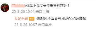 有網(wǎng)友在評論里留言提問“你是不是沒買賈指導的茶葉?”對此王霜回復寫道:“謝謝啊,不需要買,他送我們姑娘喝。”