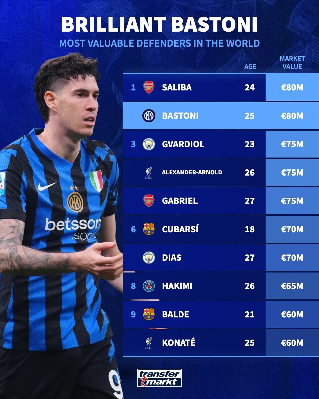 2025-03-26 11:23:51德轉最新后衛身價top10:巴斯托尼8000萬歐,與薩利巴并列第1