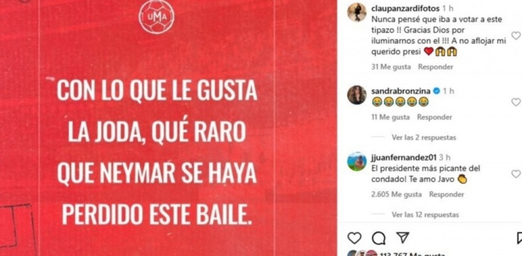 在INS上,米萊嘲諷了本場比賽缺陣的內馬爾,他寫道:內馬爾是如此熱愛聚會,他這次缺席讓人感到奇怪。