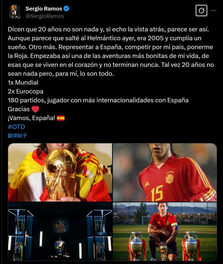 2025-03-27 11:10:57拉莫斯更新社媒,慶祝他代表西班牙國家隊首秀20周年
