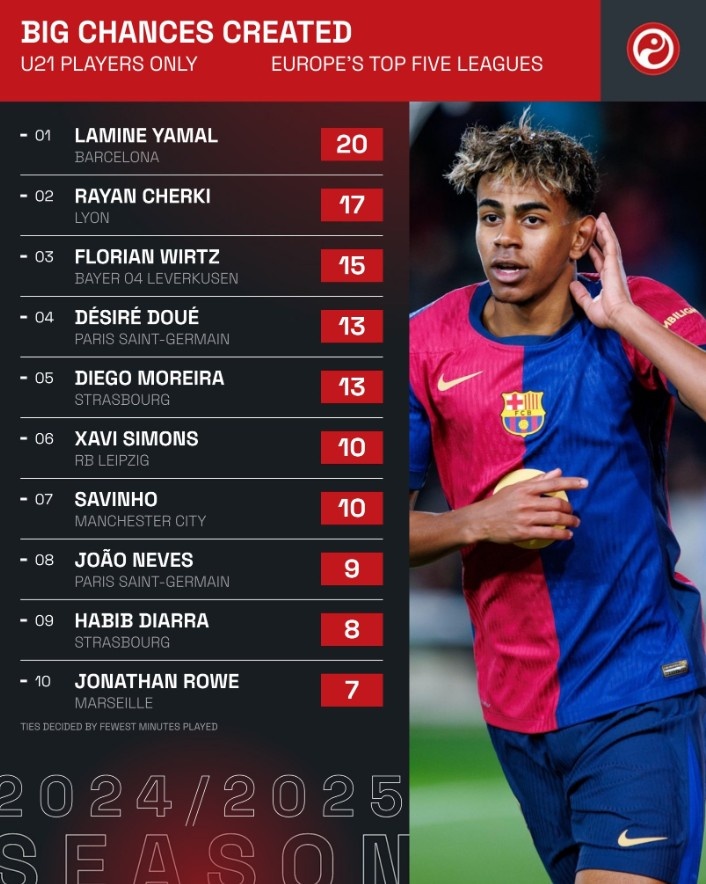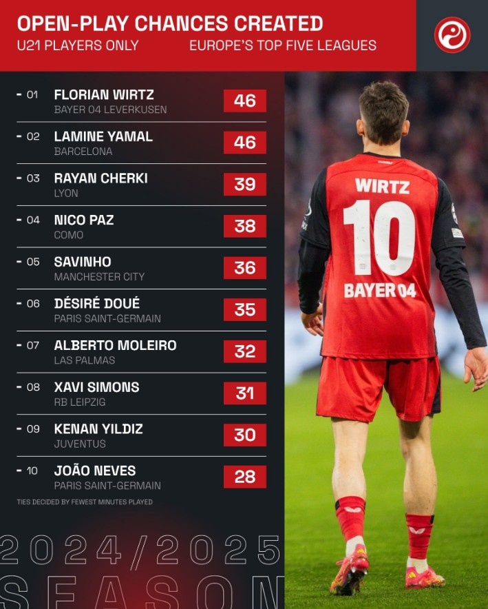2025-03-27 11:12:54五大聯賽U21運動戰創造機會排行:亞馬爾、維爾茨46次并列榜首