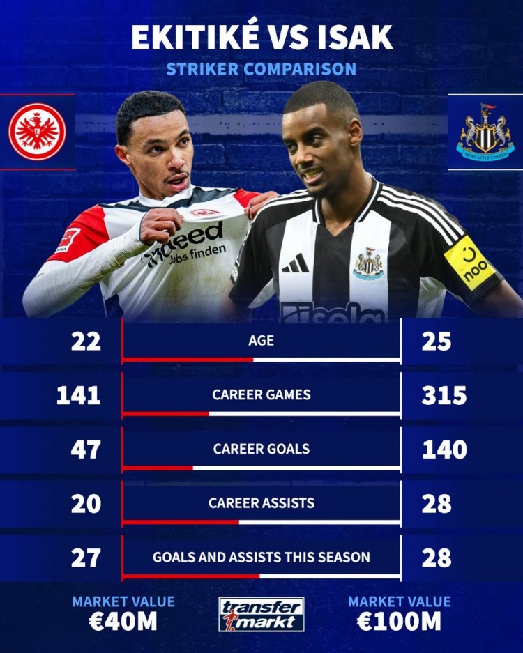 2025-03-28 13:18:53槍迷選誰?22歲埃基蒂克身價4千萬&造27球,25歲伊薩克1億&造28球