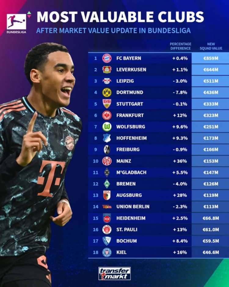 2025-03-28 13:21:54德甲球隊德轉身價榜:拜仁8.59億歐居首,藥廠萊比錫二三位