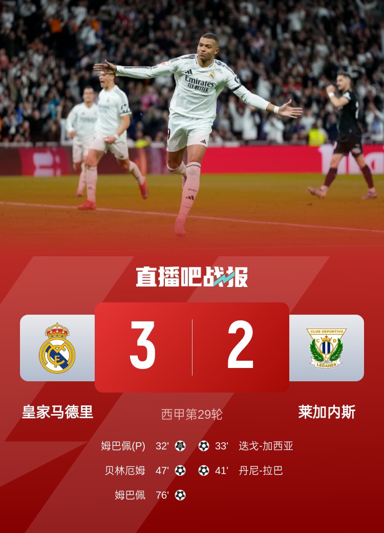 西甲第29輪,皇馬3-2萊加內斯,聯賽三連勝。上半場,居勒爾造點,姆巴佩點射,迭戈-加西亞迅速扳平,丹尼-拉巴破門反超;下半場,貝林厄姆建功,姆巴佩再下一城。