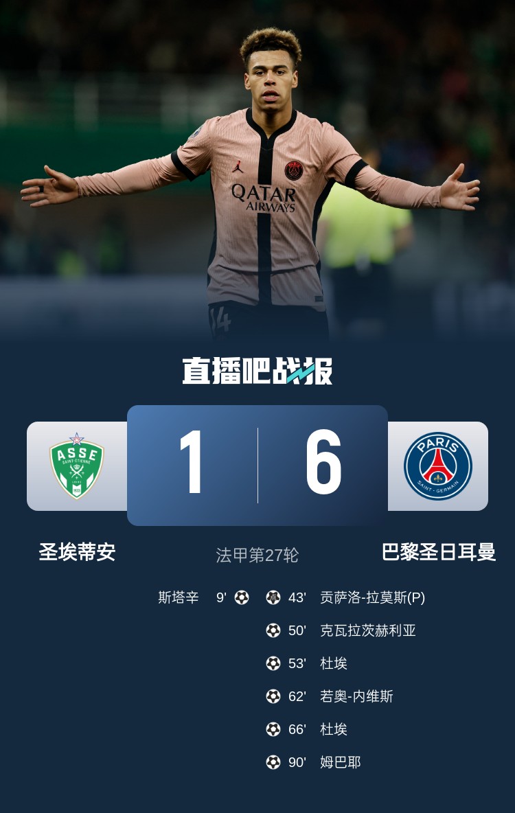 法甲第27輪,巴黎6-1大勝圣埃蒂安,暫以22分優勢領跑。上半場,斯塔辛首開紀錄,貢薩洛-拉莫斯點射扳平;下半場,克瓦拉茨赫利亞擴大比分,內維斯破門,杜埃梅開二度,姆巴耶打進一球。