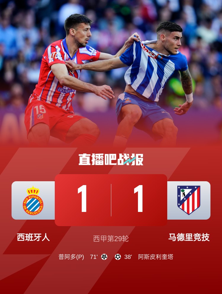 西甲第29輪,馬競客場1-1西班牙人。上半場,勒諾爾芒傷退,阿斯皮利奎塔凌空無解世界波;下半場,朗格萊魯莽拉人送點,普阿多點射扳平。
