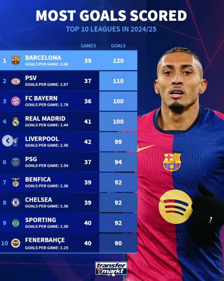 2025-02-26 20:04:11本賽季歐洲前十聯賽進球榜:巴薩120球居首,拜仁&皇馬&紅軍在列