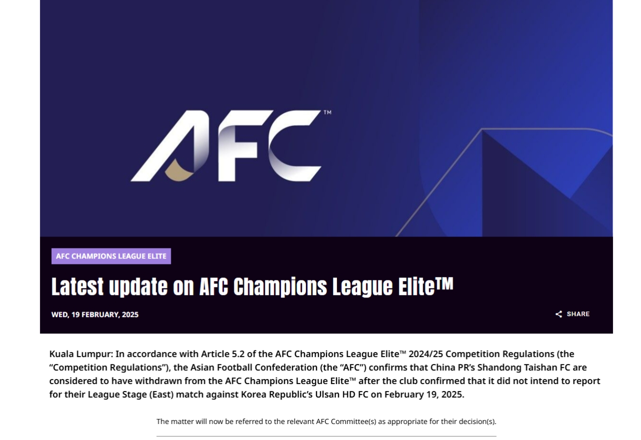 2月19日訊 今日亞足聯突然發布公告,宣布山東泰山確認不參加今晚對陣蔚山HD比賽,并且被視為退出亞冠。