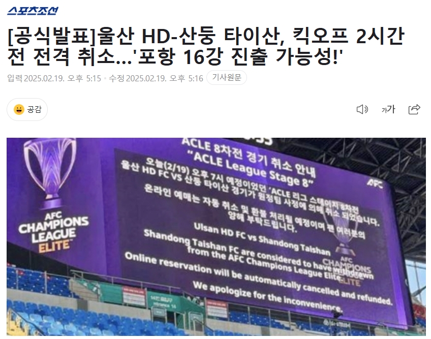 韓國職業足球大聯盟相關人士表示:“據悉山東隊于19日向亞足聯發函要求取消比賽,亞足聯將作出最終決定,但據悉不會僅僅只是取消比賽,而是取消山東隊本賽季的亞冠比賽資格。俱樂部方面稱,泰山隊取消比賽的理由是‘球員健康問題’。”