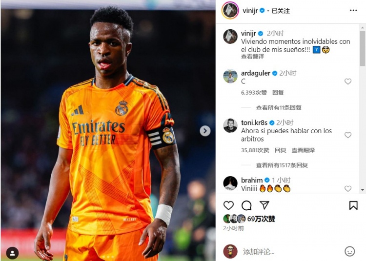 2025-02-27 10:00:14維尼修斯社媒發文慶祝勝利:與我夢中的俱樂部一起經歷難忘時刻