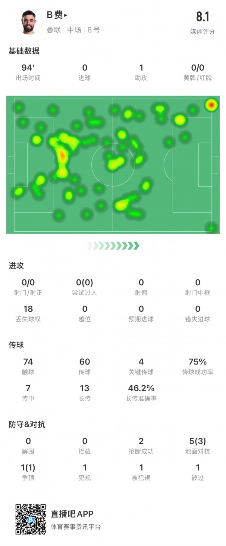 2025-02-27 10:02:08B費本場數據:1次助攻,4次關鍵傳球,14次長傳成功7次
