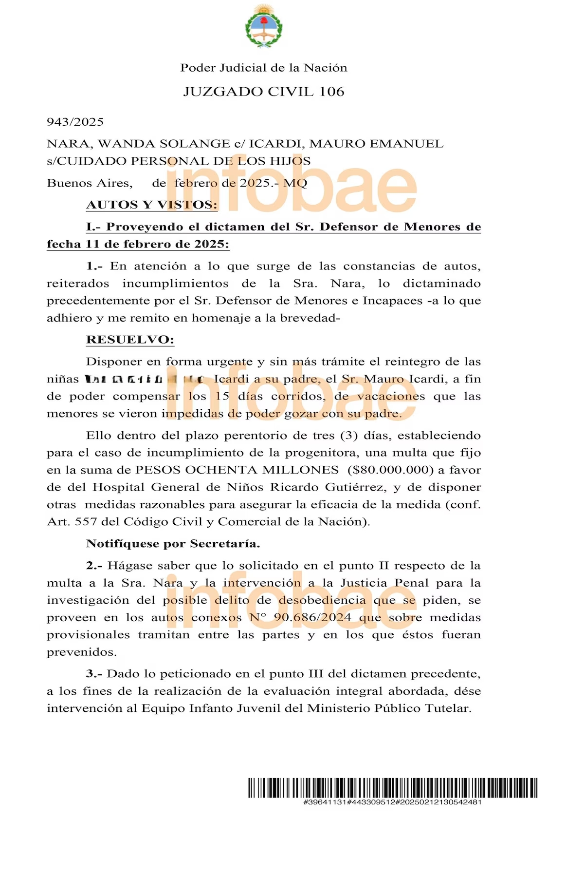 阿媒Infobae報道,法院做出了有利于伊卡爾迪的裁決,旺達需要在三天內(nèi)歸還兩個女兒,否則將面臨罰款。