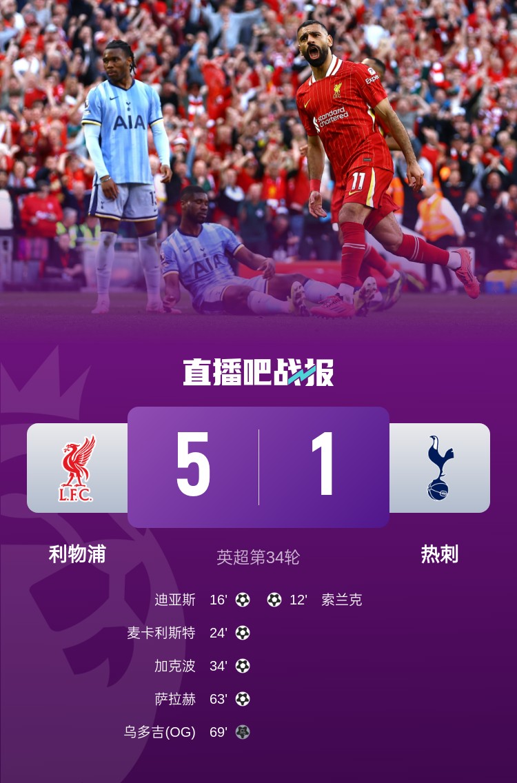 薩拉赫破門,迪亞斯、麥卡利斯特建功,利物浦5-1熱刺,賽季雙殺對手,提前四輪奪冠,收獲隊史第20次頂級聯(lián)賽冠軍。