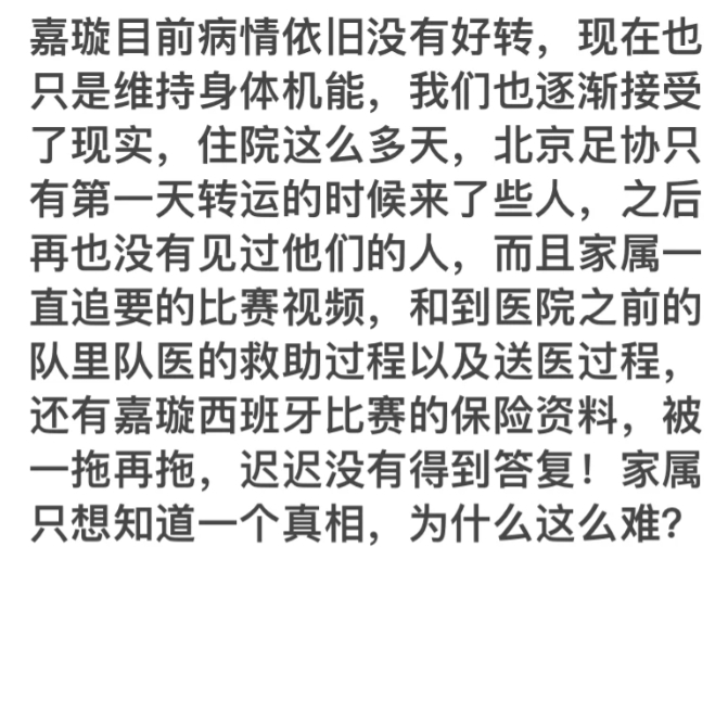 嘉璇目前病情依舊沒有好轉,現在也只是維持身體機能,我們也逐漸接受了現實,住院這么多天,北京足協只有第一天轉運的時候來了些人,之后再也沒有見過他們的人,而且家屬一直追要的比賽視頻,和到醫院之前的隊里隊醫的救助過程以及送醫過程,還有嘉璇西班牙比賽的保險資料,被一拖再拖,遲遲沒有得到答復!家屬只想知道一個真相,為什么這么難?