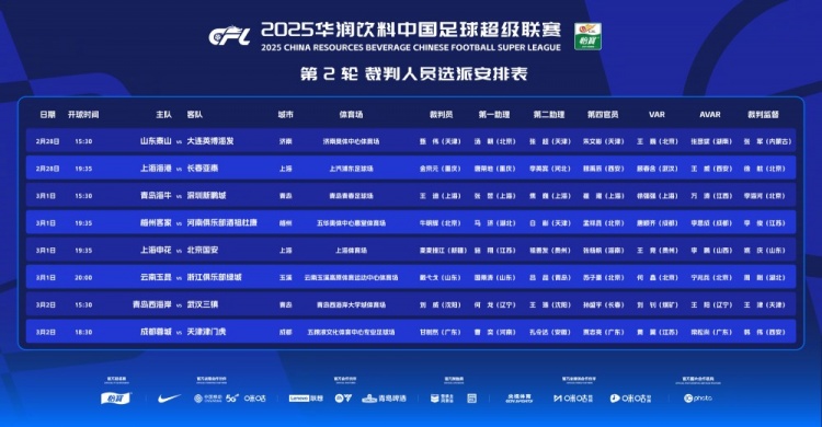 2025-02-28 15:01:43中超第2輪裁判安排:麥麥提江吹罰申花vs國安,VAR王競,無李海新