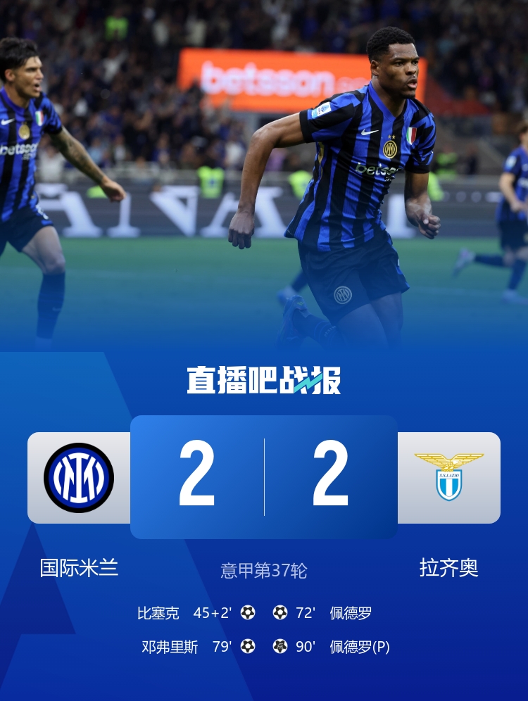 意甲聯(lián)賽第37輪,國米2-2遭拉齊奧絕平,佩德羅梅開二度,比塞克進(jìn)球+送點(diǎn)。