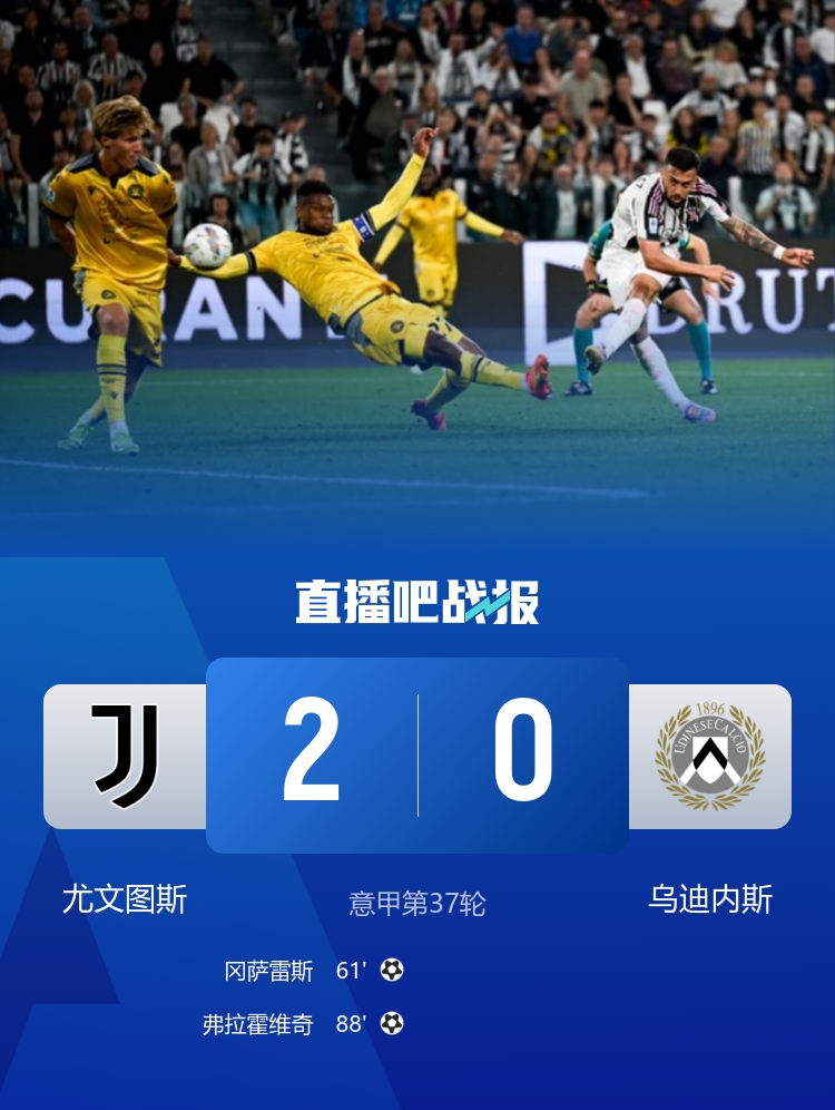 意甲第37輪,尤文圖斯2-0烏迪內(nèi)斯,掌握爭四主動(dòng)權(quán),岡薩雷斯、弗拉霍維奇進(jìn)球。