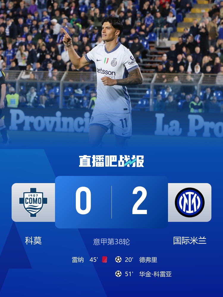 意甲第38輪,國米2-0十人科莫。上半場(chǎng),恰爾汗奧盧角球助攻德弗里破門,塔雷米錯(cuò)失良機(jī),雷納飛鏟染紅;下半場(chǎng),科雷亞再下一城。