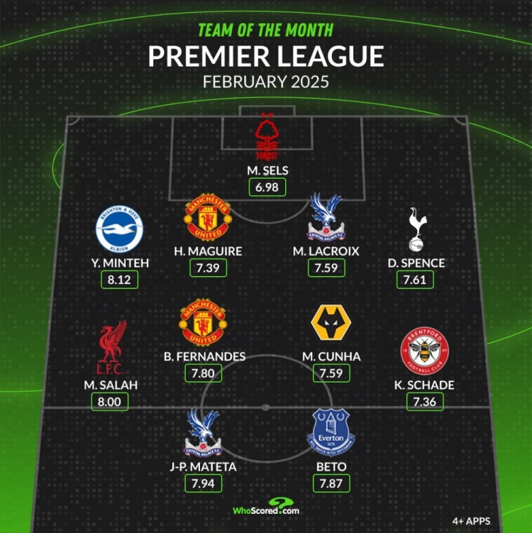 2025-03-01 05:00:17whoscored英超2月最佳陣:薩拉赫、B費領銜,馬奎爾、庫尼亞在列