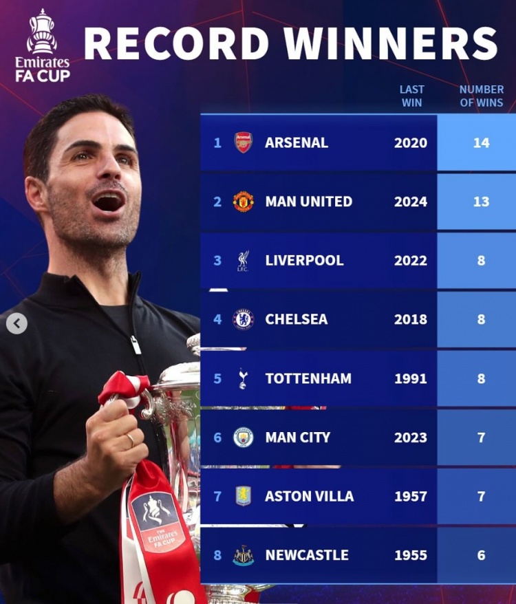 2025-03-01 05:00:19本屆BIG6僅剩曼市雙雄!足總杯歷史奪冠榜:阿森納14次、曼聯13次