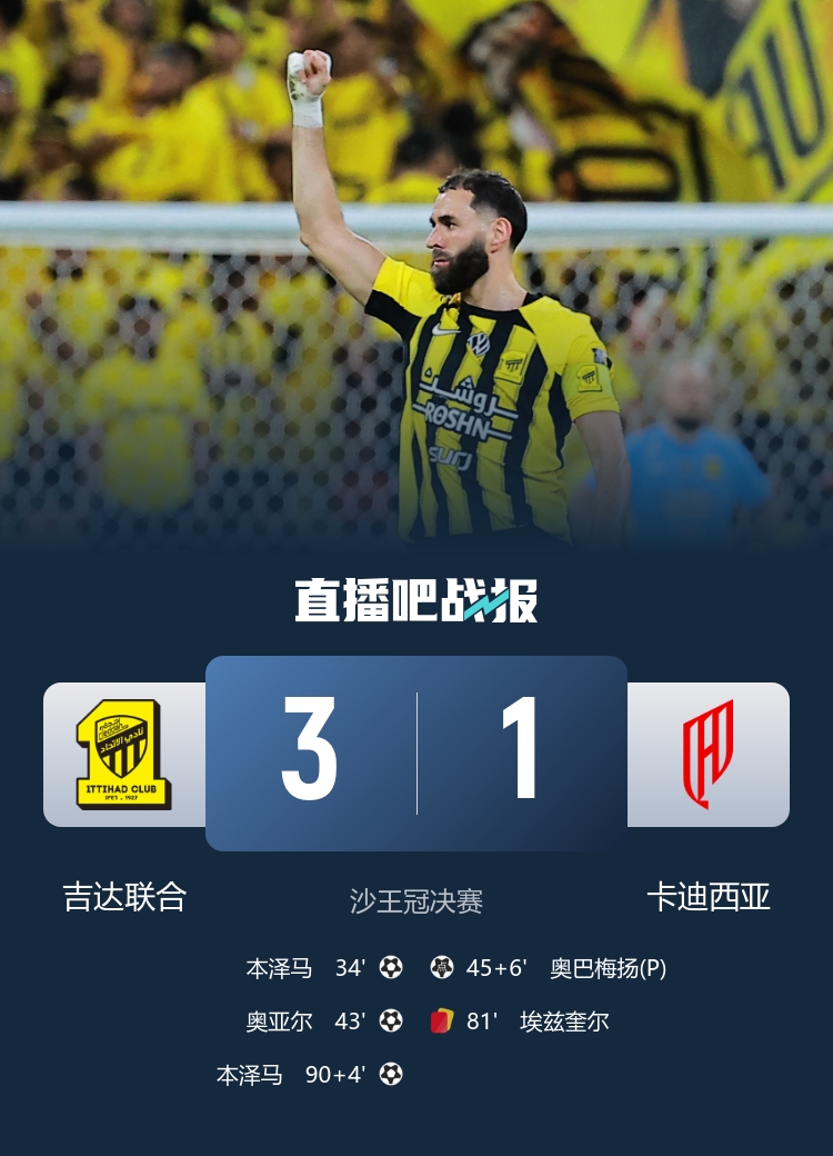 沙王冠決賽,本澤馬梅開二度,吉達聯合3-1卡迪西亞。