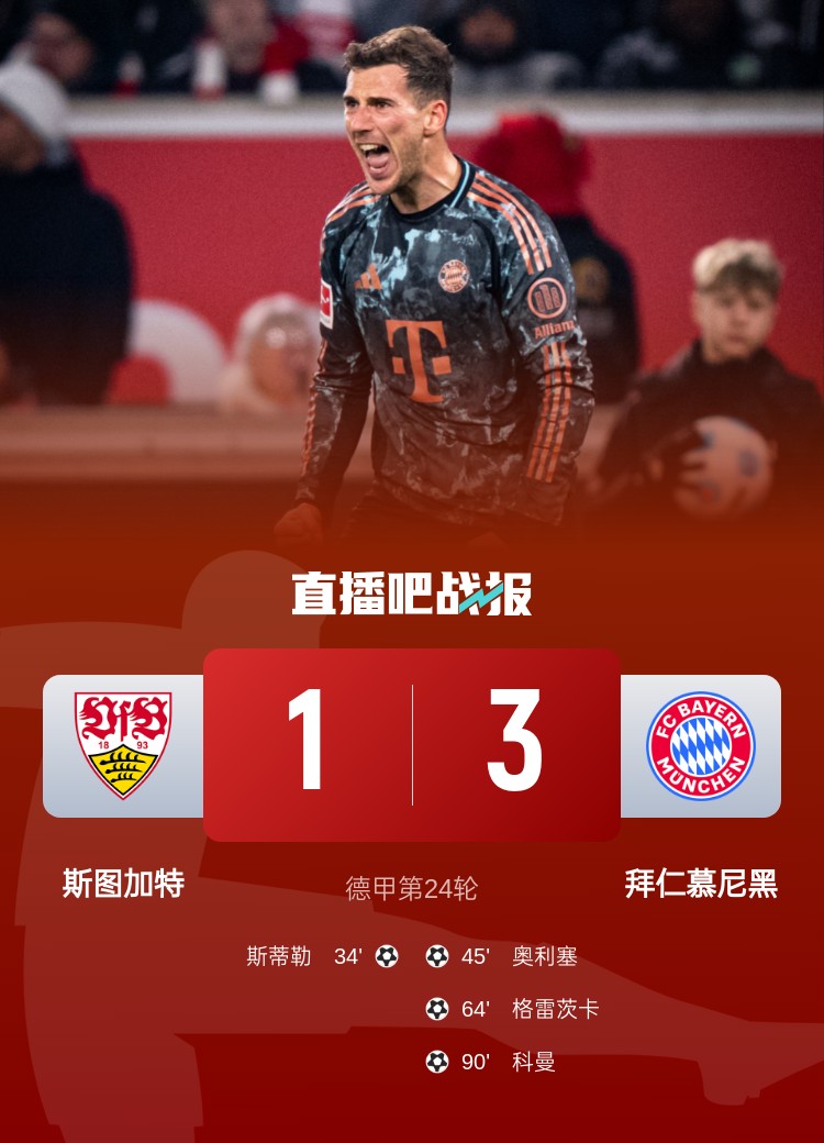 德甲第24輪,拜仁3-1客勝斯圖加特。上半場(chǎng),斯蒂勒先拔頭籌,奧利塞扳平;下半場(chǎng),格雷茨卡反超比分,科曼鎖定勝局。