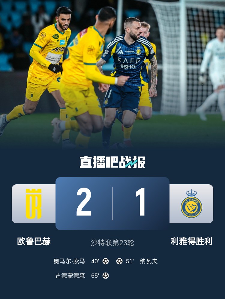 沙特聯(lián)第23輪,利雅得勝利1-2不敵歐魯巴赫。上半場(chǎng),奧馬爾凌空斬;下半場(chǎng),納瓦夫替補(bǔ)扳平,古德蒙德森世界波,C羅任意球被撲。