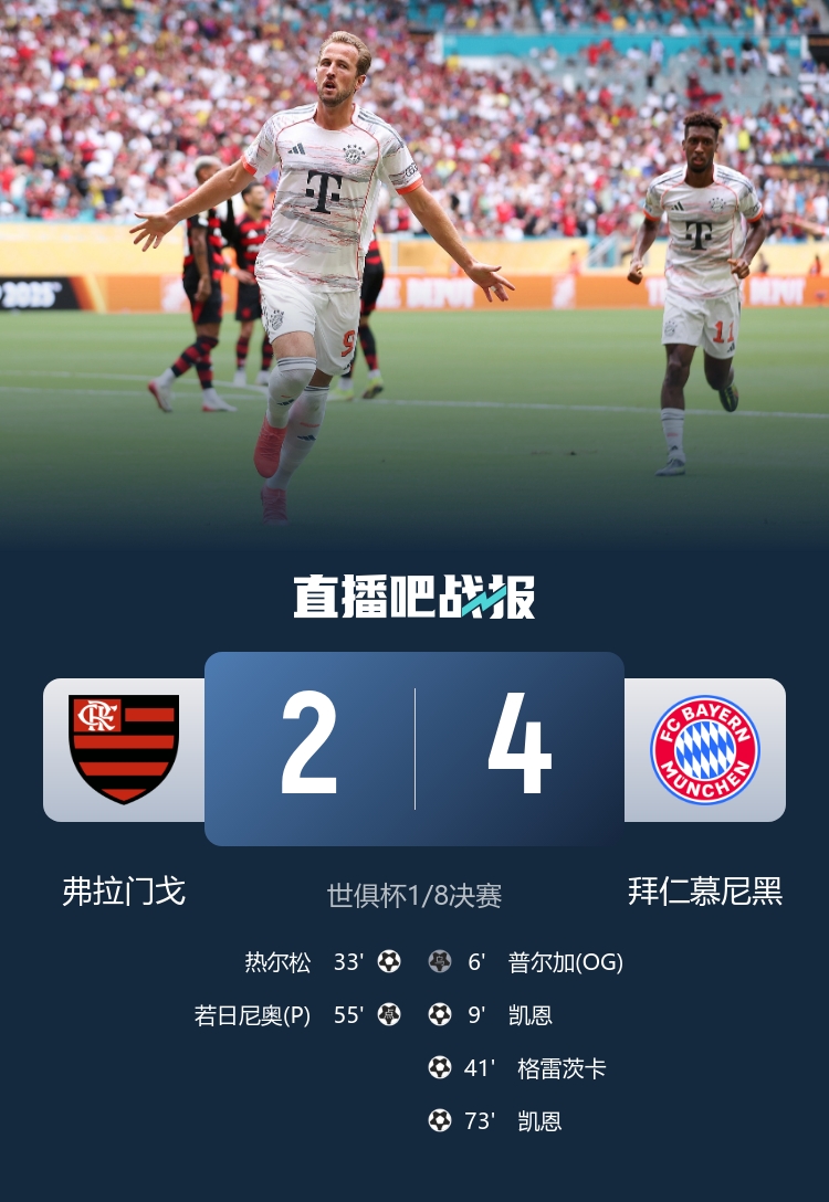 將戰(zhàn)巴黎!拜仁4-2弗拉門戈晉級(jí)8強(qiáng) 凱恩雙響格雷茨卡世界波