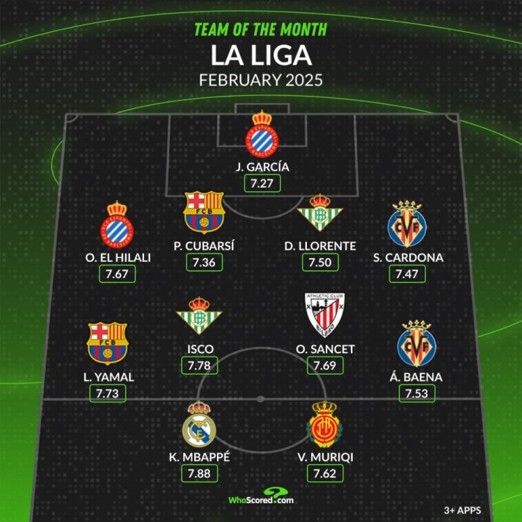 2025-03-02 21:44:18whoscored西甲2月最佳陣:姆巴佩、亞馬爾領(lǐng)銜,伊斯科在列