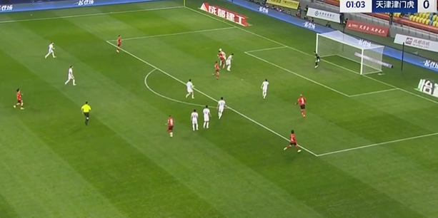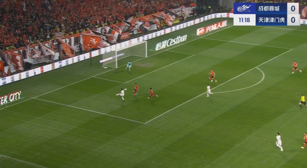 第12分鐘,津門虎后場長傳,哈達斯禁區內凌空端向中路,王秋明包抄打門得手,津門虎1-0領先蓉城。