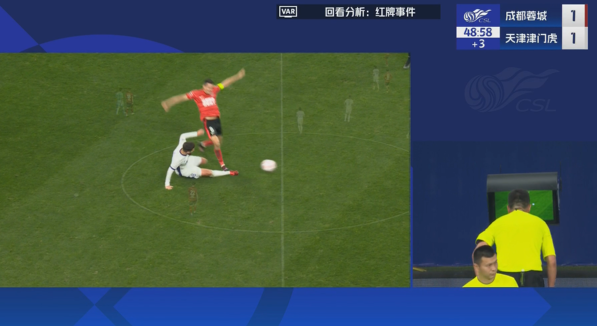 上半場補時階段,周定洋搶球時踩到哈達斯,視頻助理裁判介入,主裁判查看回放后向周定洋出示紅牌。