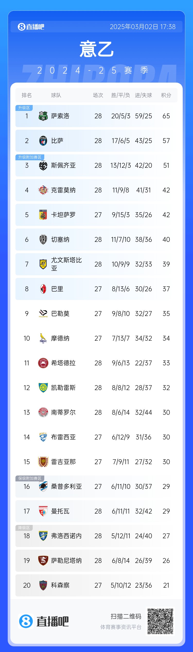 2025-03-02 21:46:14薩索洛要回來了——本輪意乙1-0擊敗第二比薩,領先第三14分