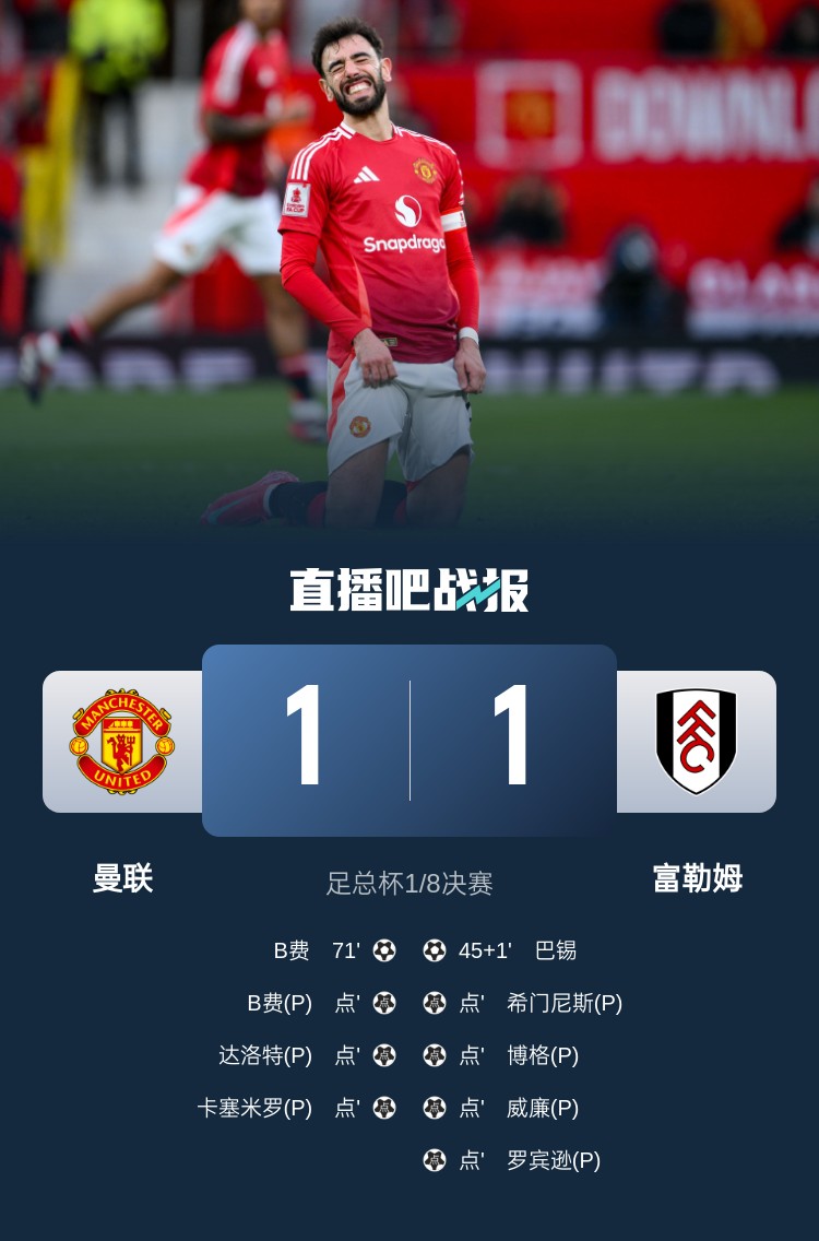 足總杯1/8決賽,曼聯1-1,點球大戰3-4不敵富勒姆,止步16強,林德洛夫、齊爾克澤失點。