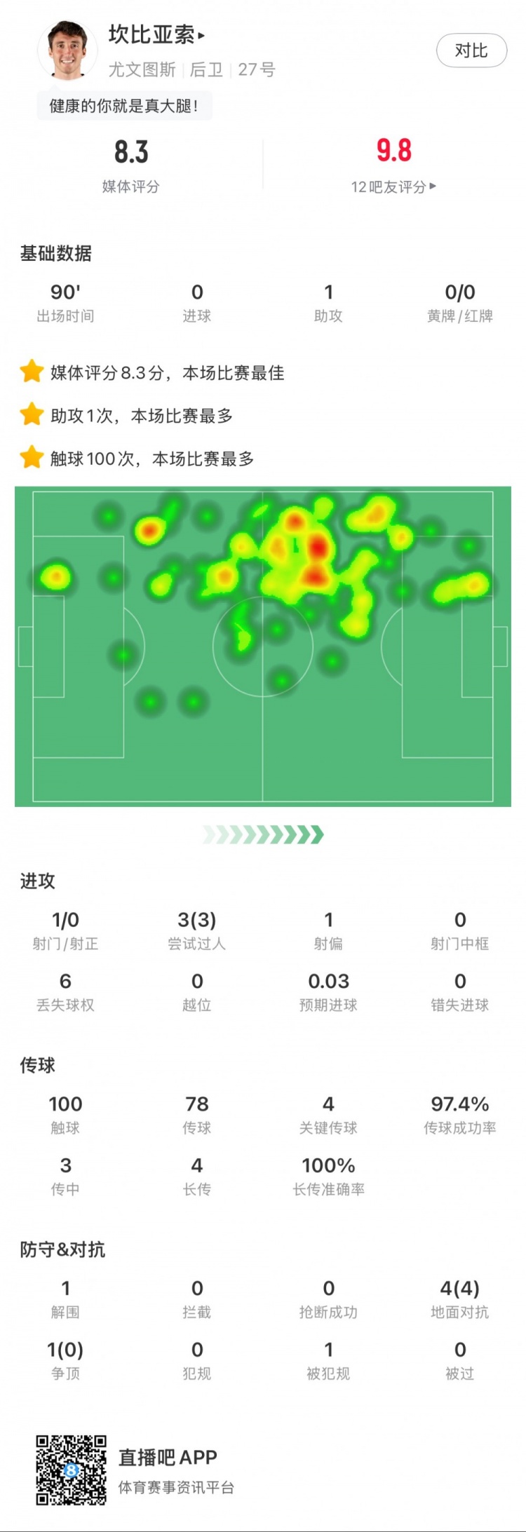 2025-03-04 11:40:00坎比亞索本場數據:1次助攻,4次關鍵傳球,3次成功過人