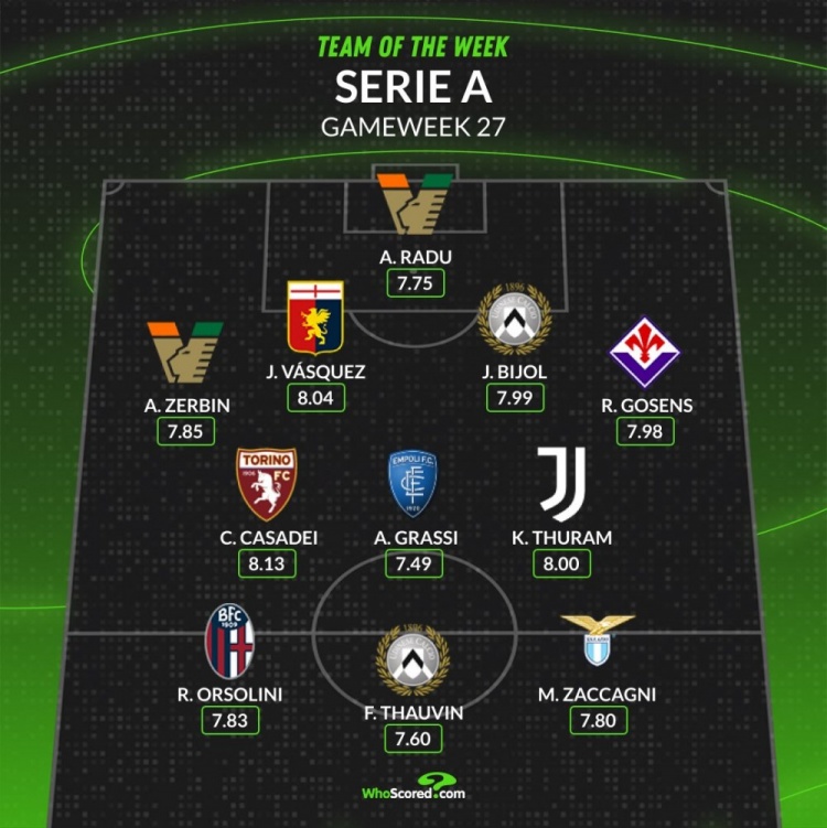 2025-03-04 17:47:50whoscored意甲本周最佳陣:K-圖拉姆&拉杜領銜 卡薩迪&戈森斯在列