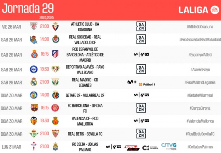 3月4日訊 西甲官網(wǎng)剛剛公布了第29輪開球時(shí)間,其中皇馬主場(chǎng)迎戰(zhàn)萊加內(nèi)斯的比賽將于北京時(shí)間3月30日凌晨4點(diǎn)進(jìn)行,馬競(jìng)對(duì)陣西班牙人、巴薩對(duì)陣赫羅納的比賽則分別將于3月29日、30日晚上舉行。