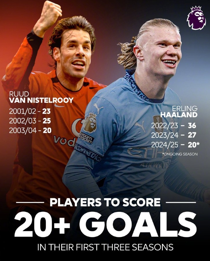 2025-03-04 23:30:52英超歷史只有兩名球員生涯前三賽季進球20+:分別是范尼和哈蘭德