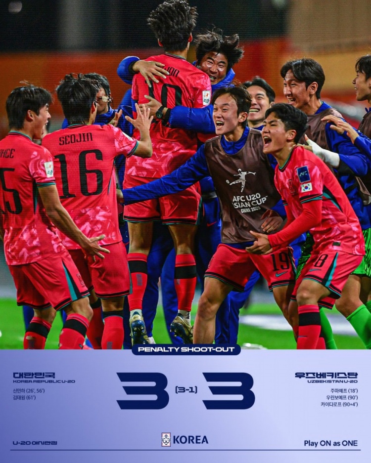 2月24日訊 U20亞洲杯1/4決賽,韓國U20和烏茲別克斯坦U20在常規時間戰成3-3,最終通過點球大戰韓國U20總比分6-4淘汰烏茲別克斯坦U20,獲得世青賽資格。