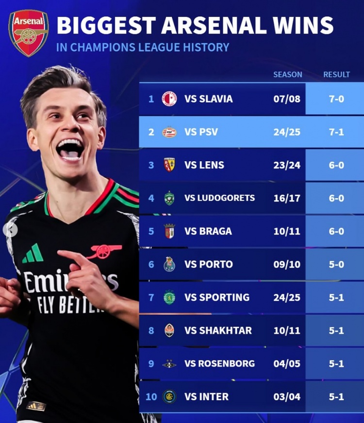 2025-03-06 00:07:44德轉列阿森納隊史歐冠大勝榜:7-0布拉格斯拉維亞、5-1國米