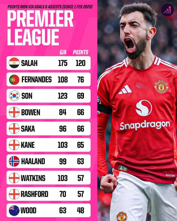 2025-03-06 22:39:495年英超參與進球為球隊搶分榜:薩拉赫120分,B費第2、拉師傅第9