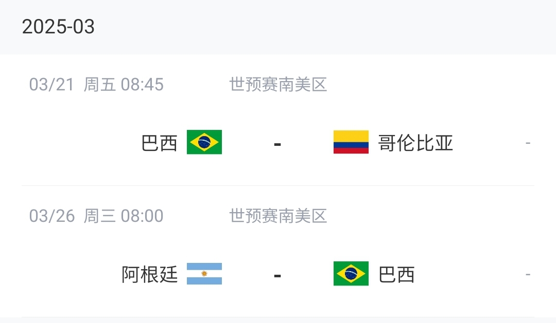 在3月份的世預賽中,巴西將先后交手哥倫比亞和阿根廷,目前巴西隊5勝3平4負積18分,位列第5。