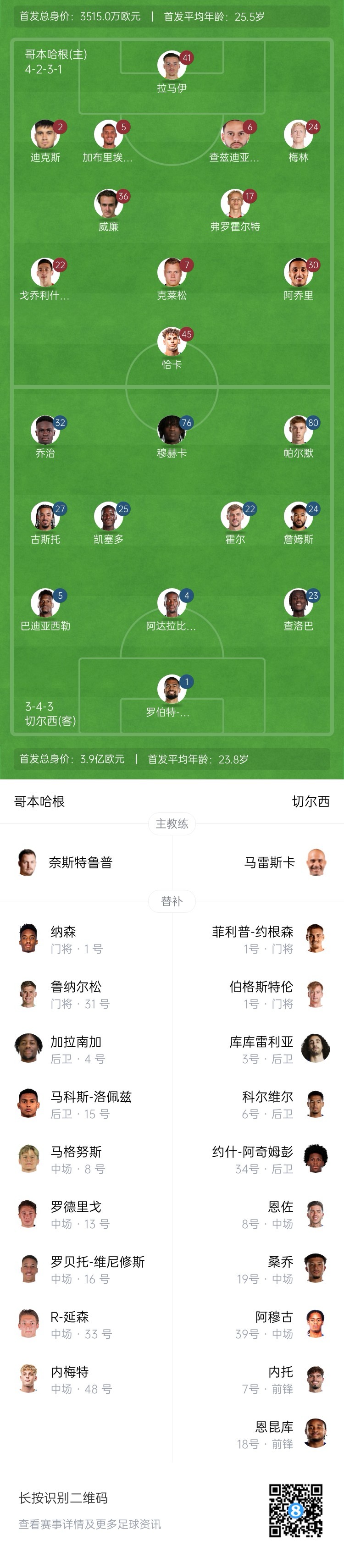 哥本哈根首發(fā):41-拉馬伊、2-迪克斯、5-加布里埃爾、6-查茲迪亞科斯、24-梅林、36-威廉-克萊姆、17-弗羅霍爾特、22-戈喬利什維利、7-克萊松、30-阿喬里、45-恰卡